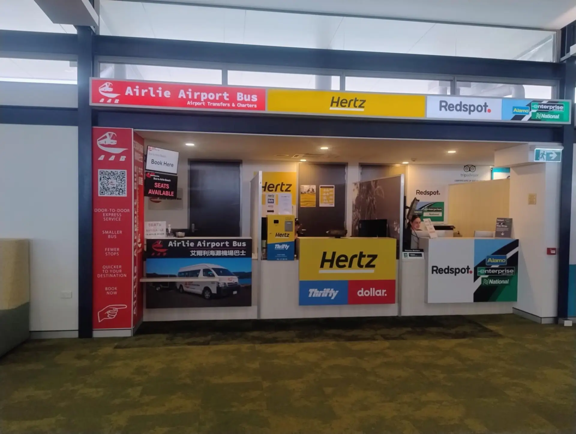 After collecting your luggage, walk straight ahead. Our desk is directly opposite the baggage carousel 2 with bright red “Airlie Airport Bus” signage – you can’t miss us!